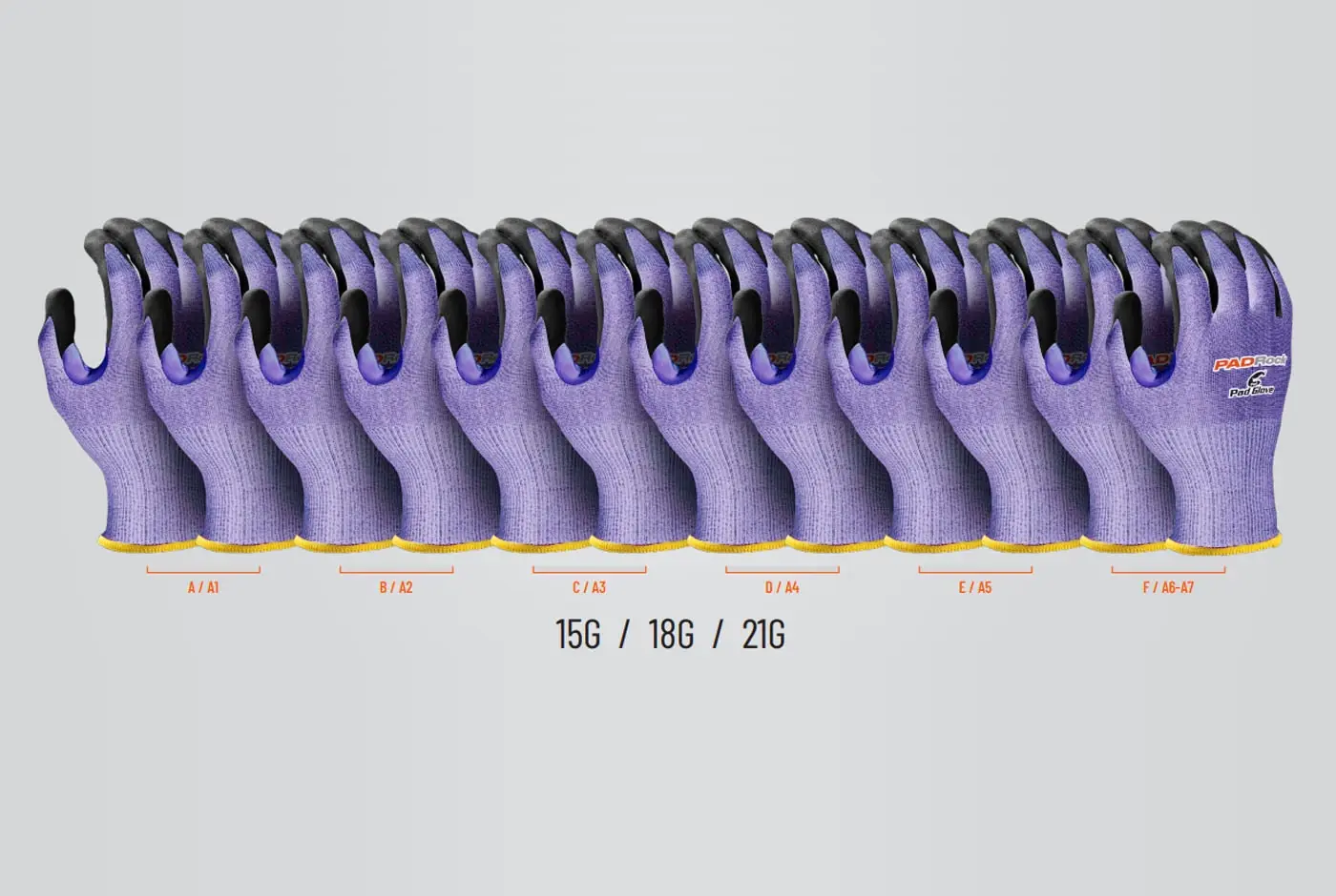 Pad Glove offers advanced Pad Rock multilevel structures—ranging from level “A/A1” to level “F/A9”—to provide comprehensive cut protection. Think of PAD ROCK as the backbone of the glove: an engineered yarn knit that gives workers strength, durability, and flexibility so they can stay focused on the job, not the gear.